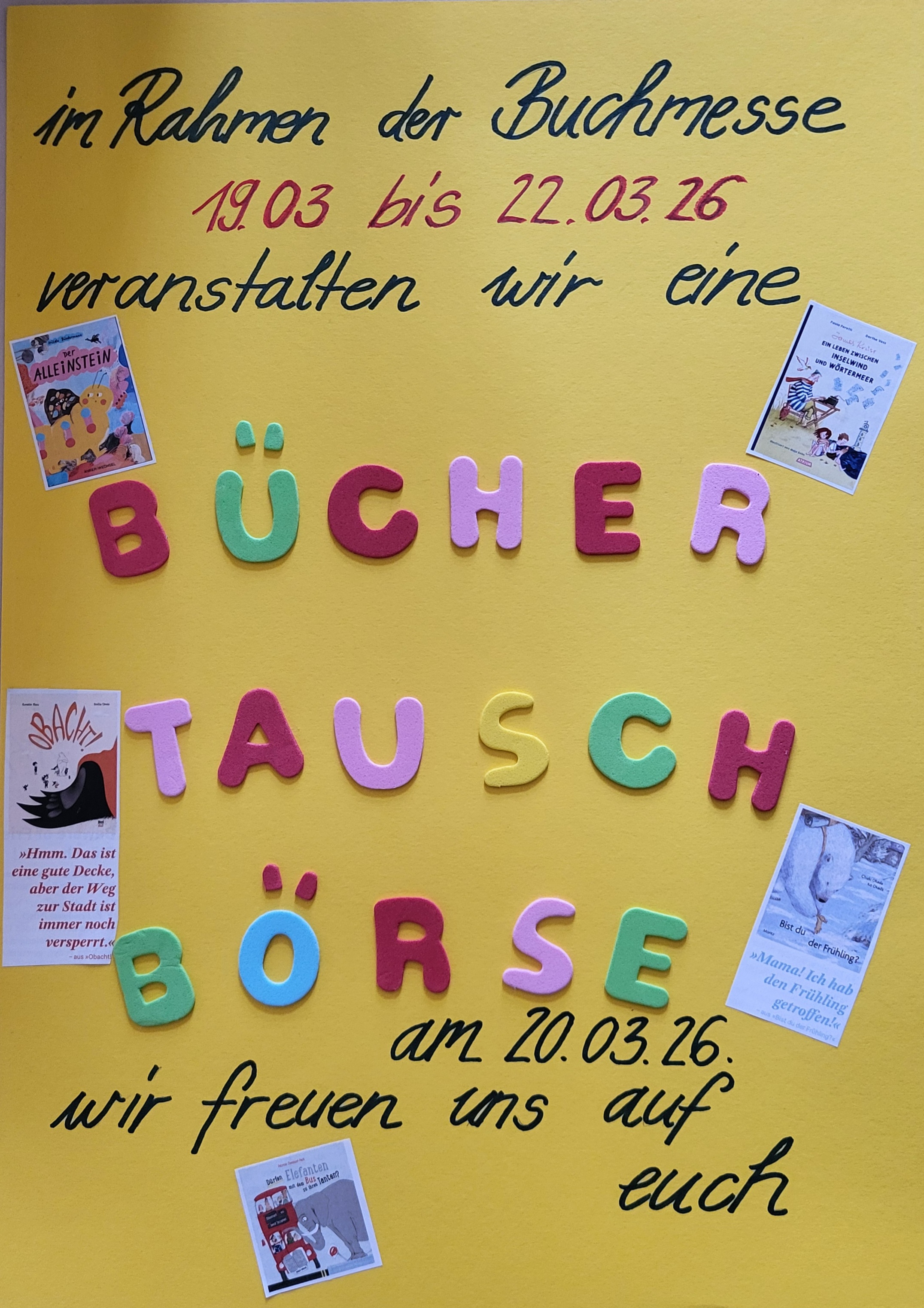 am 20.03. findet bei uns im Speiseraum von 14.00 Uhr bis 15.30 Uhr eine Büchertauschbörse statt. Ihre Kinder können vom 18.03.-20.03. morgens vor Schulbeginn in der Oase Bücher abgeben, die sie am Freitag, 20.03. gegen ein anderes Buch tauschen können. Genaue Informationen sowie der Bücherrückgabe-Abschnitt befinden sich in der Postmappe Ihres Kindes.