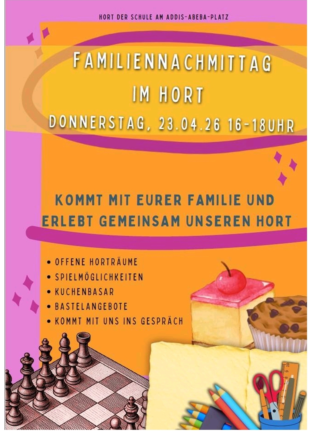 wir laden Sie herzlich zu unserem Familiennachmittag im Hort am 23.04.2026 ein!